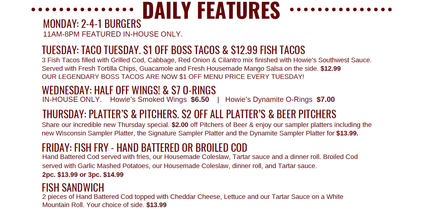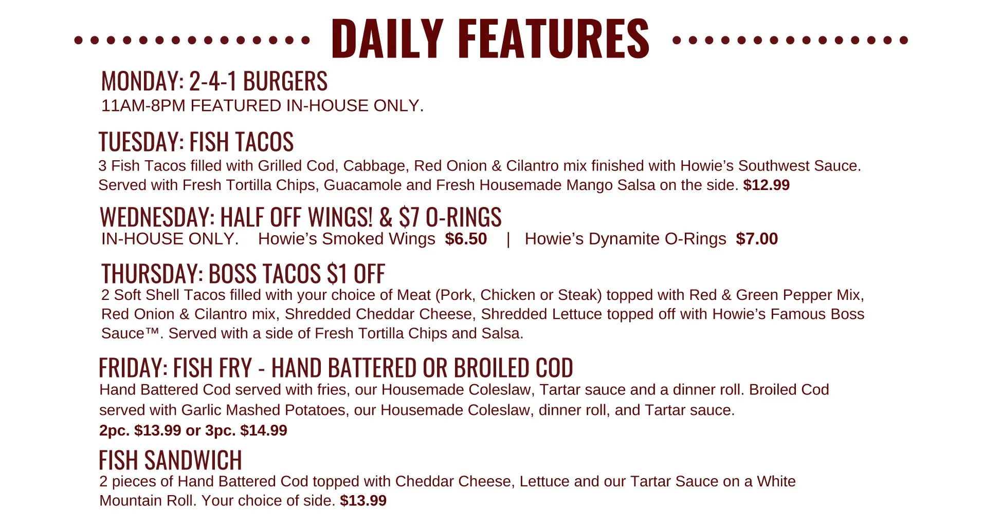See our daily features and specials here! Visit our social media pages to stay up-to-date on other unique offerings, too.