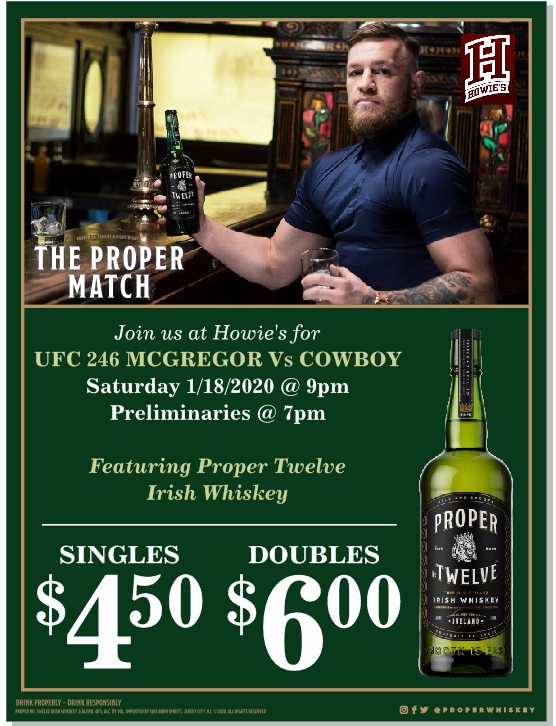 Watch Conor McGregor vs. Donald "Cowboy" Cerrone on January 18th at 9pm with us at Howie's! We are offering deals on Conor McGregor’s Proper Twelve Irish Whiskey during the fight, too!
